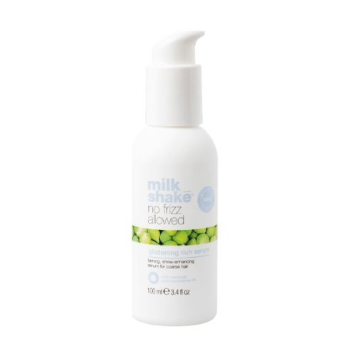 Milkshake No Frizz Allowed Glistening Rich Serum 100 ml – tai intensyviai glotninančio poveikio serumas, skirtas linkusiems šiauštis plaukams. Švelni, prabangios tekstūros formulė padeda suvaldyti garbanojimąsi, mažina statinį krūvį ir suteikia plaukams ryškų, ilgalaikį blizgesį. Serumą sudaro drėkinančios ir apsaugančios medžiagos, kurios apsaugo plauko paviršių nuo drėgmės poveikio, neapsunkindamos plaukų ir nepalikdamos riebios plėvelės.