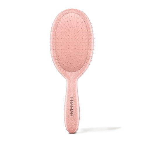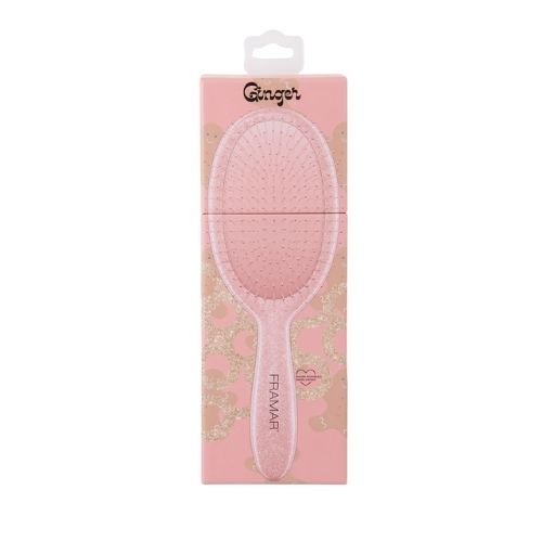 Framar Cookie Cutter Ginger Detangle Brush – blizgučiais dekoruotas plaukų šepetys su itin lanksčiais šereliais, kurie švelniai slysta per plaukus ir užtikrina neskausmingą šukavimą. Šepetys lengvai išnarplioja net sunkiausiai pašalinamus mazgelius, todėl tinka tiek kasdieninei priežiūrai, tiek storesnių, labiau linkusių veltis plaukų iššukavimui.