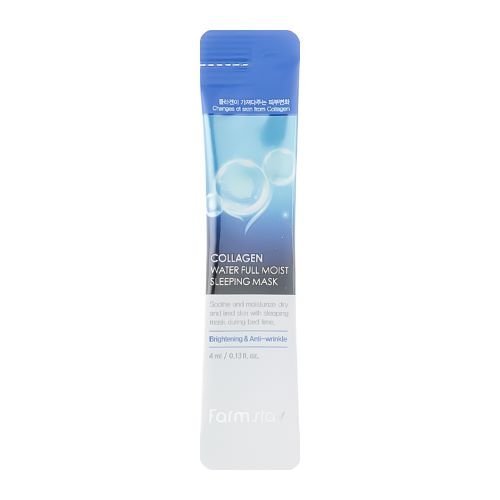 FarmStay Collagen Water Full Moist Sleeping Mask – tai naktinė drėkinamoji veido kaukė su hidrolizuotu kolagenu, skirta intensyviai puoselėti sausą, pavargusią ar drėgmės stokojančią odą. Kolageno prisotinta formulė minkština, mažina sausumo ir tempimo pojūtį, ramina sudirgimus ir padeda odai atsistatyti miego metu.